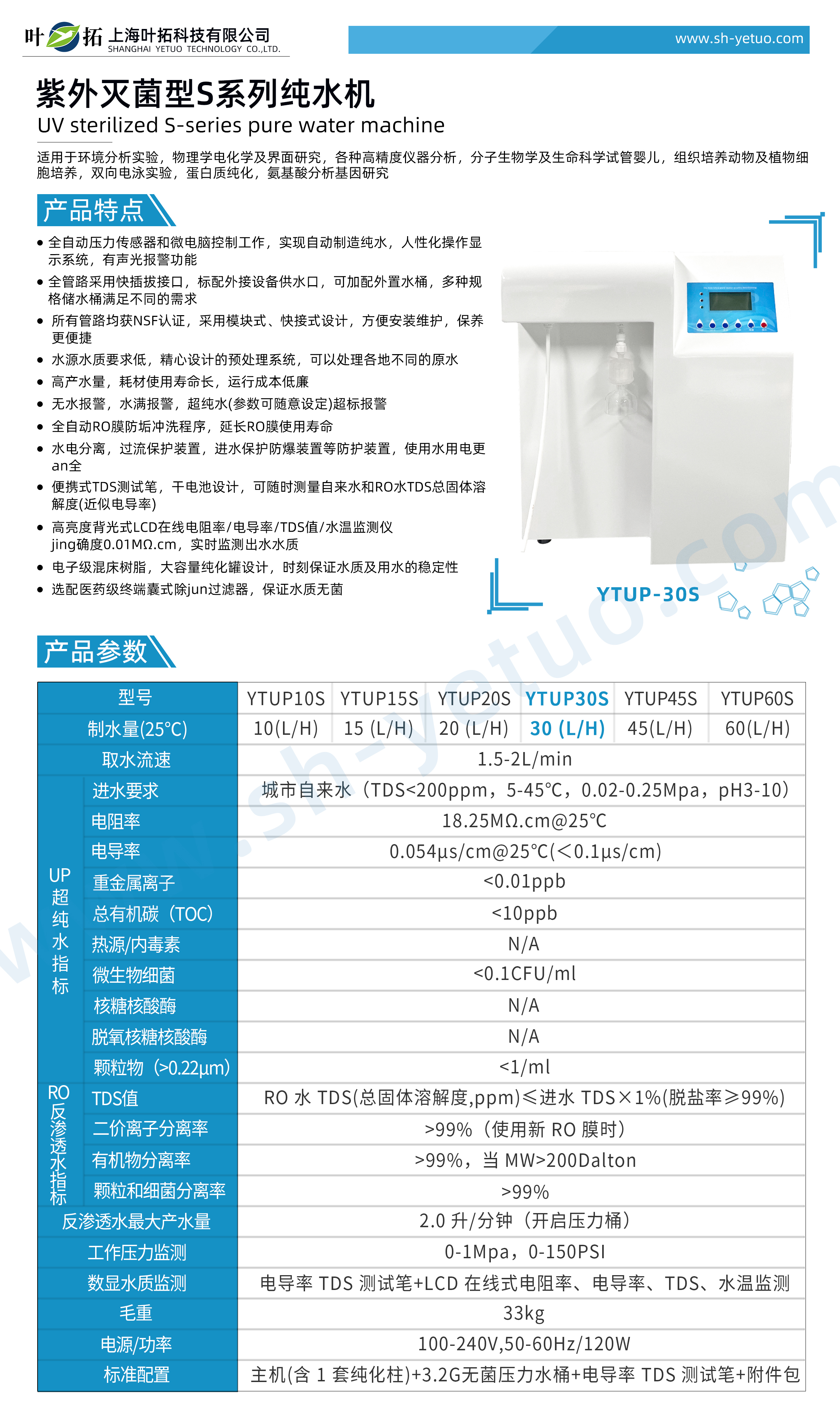 葉拓 YTUP30S 標(biāo)準(zhǔn)型超純水機(jī)詳細(xì)參數(shù)